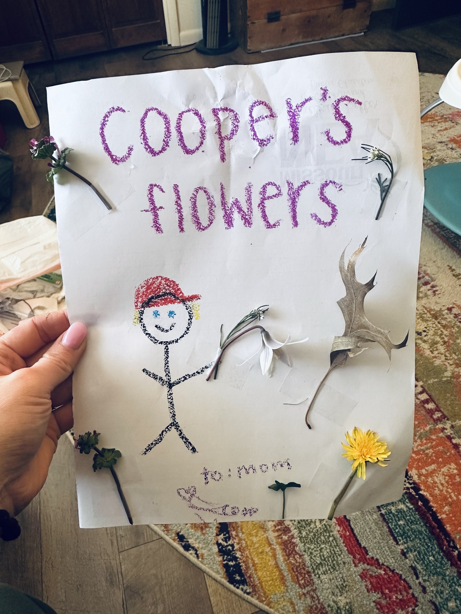 I was working in my office yesterday while Coop played outside with our nanny. I heard him come sprinting in the door. He ran into my office so excited. He dropped off these ‘mama flowers’ for me – little dandelions. Then he immediately sprinted back out to play. This boy melts my heart.